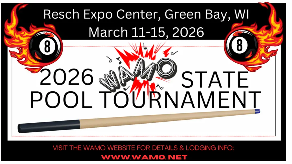 2026 WAMO State Pool Tournament will be Wednesday March 11th-Sunday, March 15th, 2026 in Green Bay. Venue: Resch Expo Center Address: 840 Armed Forces Drive, Green bay, WI 54304 Dates: Wednesday March 11th-Sunday, March 15th, 2026 Lodging: To book your hotel rooms at the discounted rate for the event, please click on these words to book: Lodging Link (Please do […]