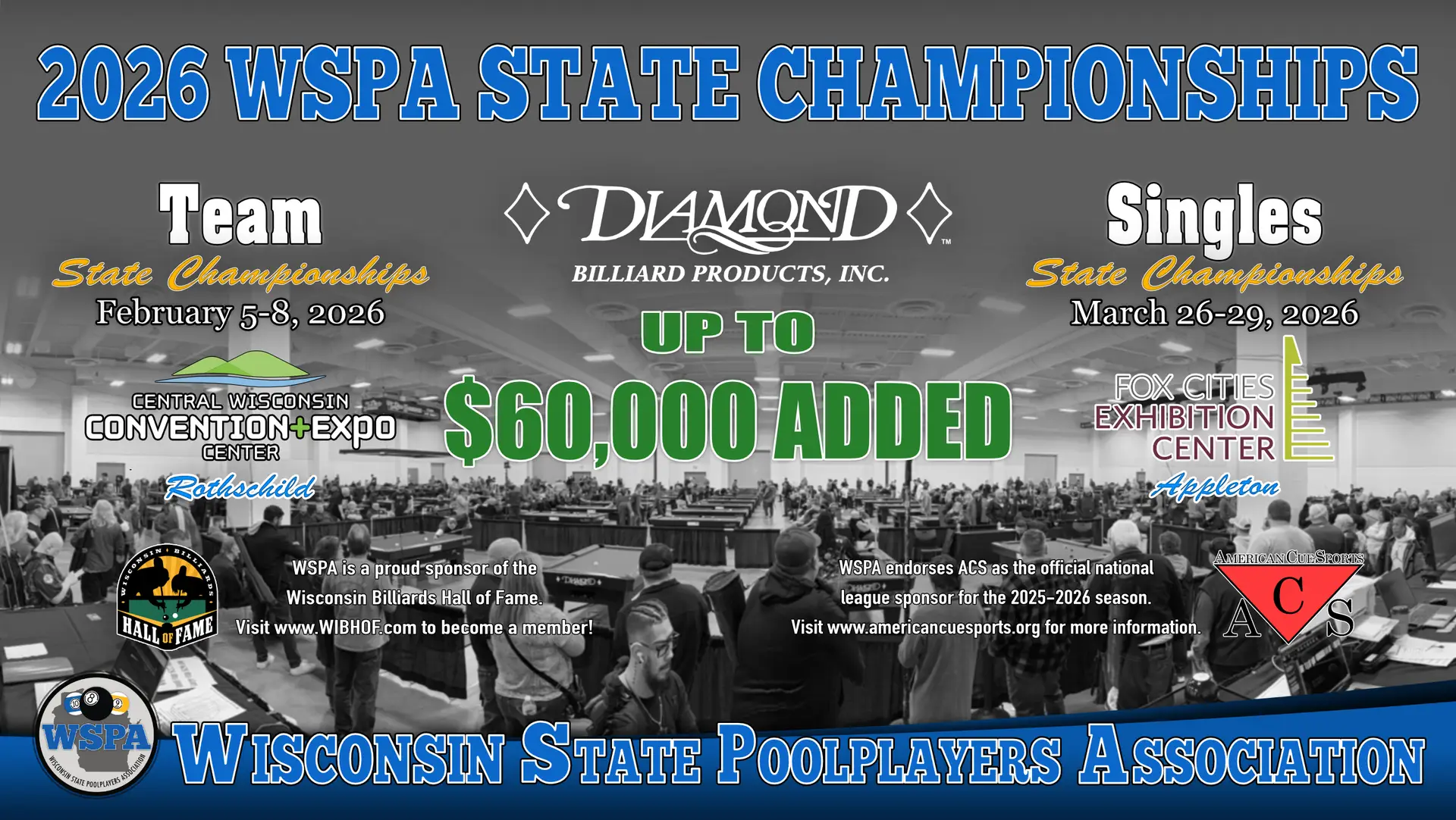 The 2026 Team State Championships will be held Thursday, February 5th through Sunday, February 8th at the Central Wisconsin Convention & Expo Center in Rothschild, WI. This event will be up to $30,000+ added and played on 140+ 7′ Diamond pool tables with Simonis 860 cloth using Aramith Duramith Tournament balls.