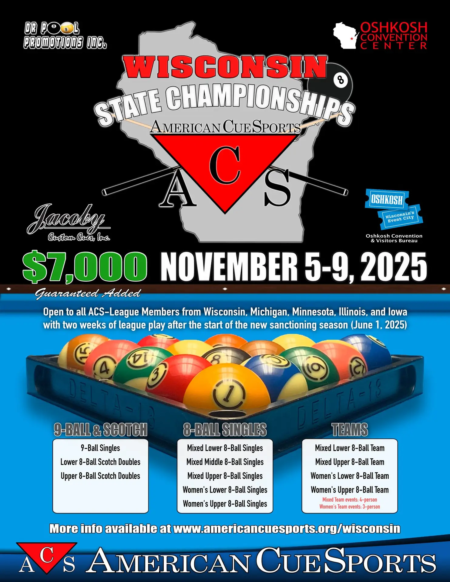 American CueSports Wisconsin State Championship Pool Tournament is November 5-9, 2025.