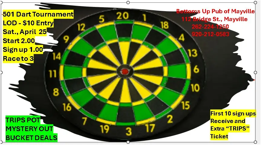 Dart Tournament on Saturday, April 25th at Bottoms Up Pub of Mayville!