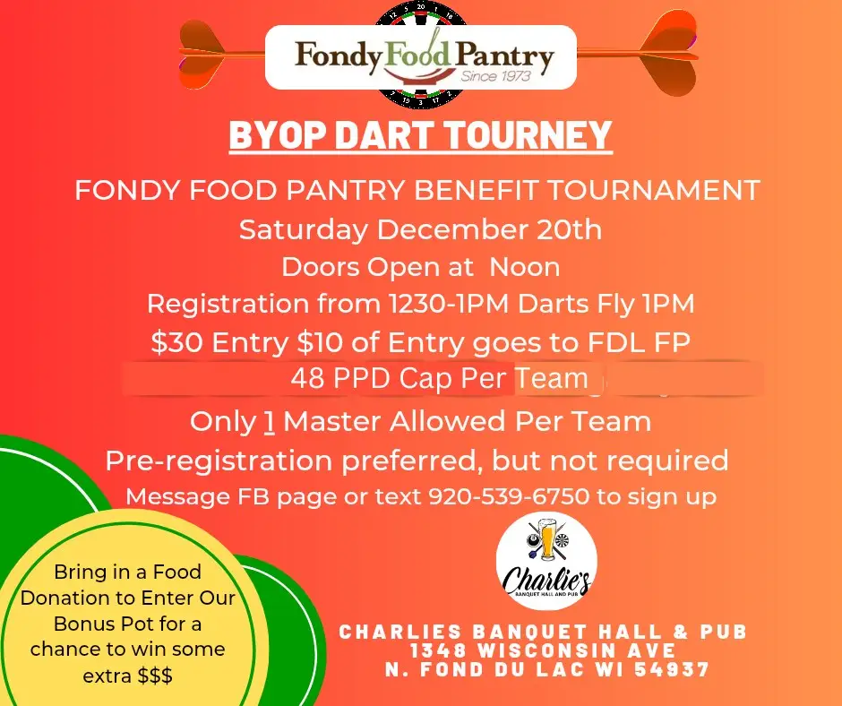 Charlie’s BYOP (Bring Your Own Partner) Benefit Dart Tournament for the Fond du Lac Food Pantry will be on Saturday, December 20th. $30 Entry $10 of Entry goes to FDL Food Pantry. Only 1 Master Player Per Team.
