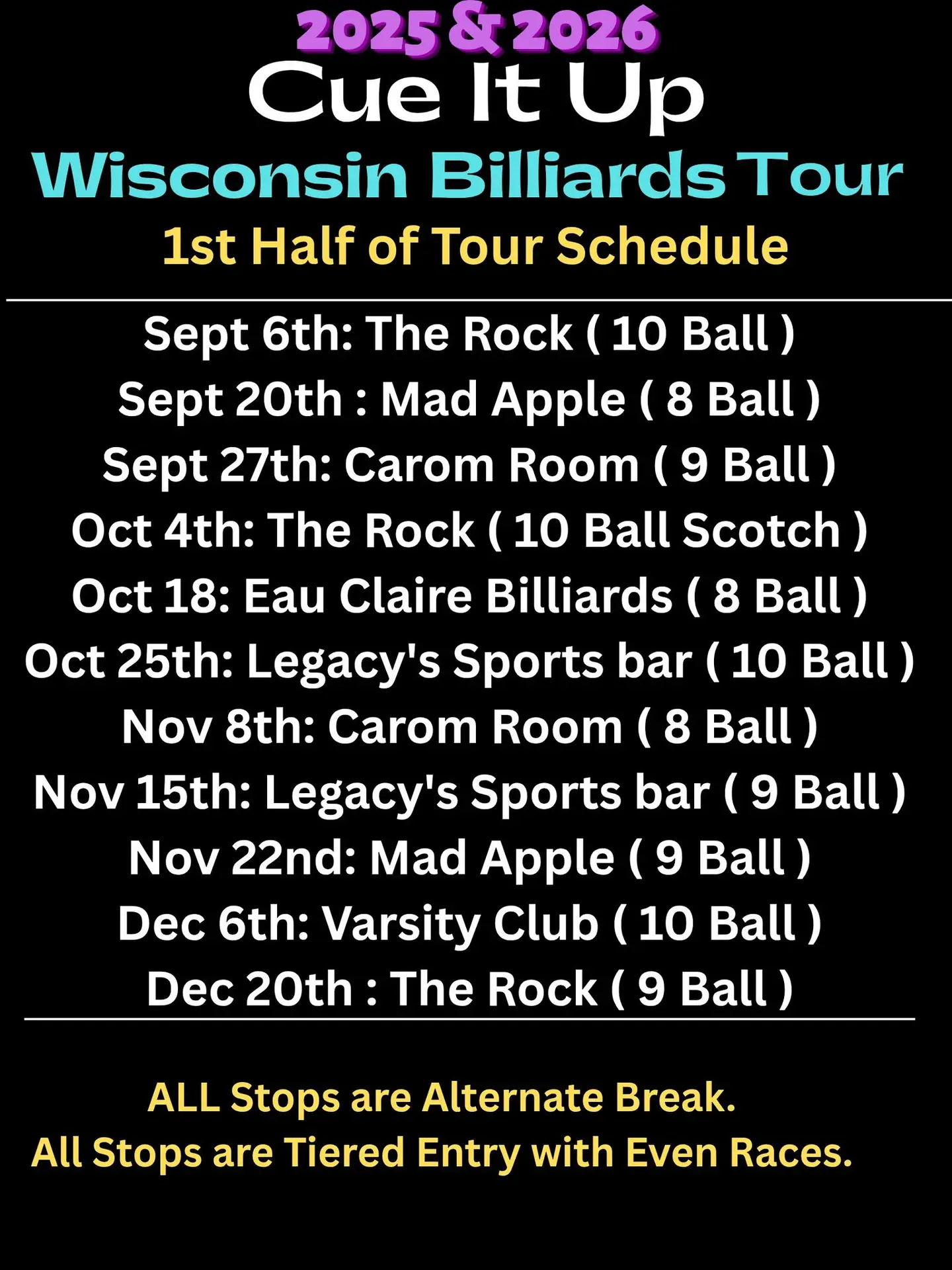 Here are the dates for the 2025-2026 Cue it Up Wisconsin Billiards Tour so far!