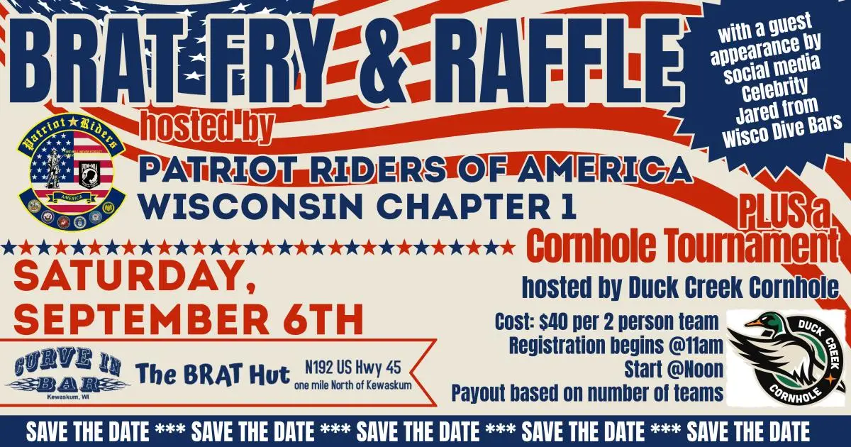 Saturday, September 6th – Curve In will be the 1000th Dive Bar Review with a Guest Appearance by Jared of Wisco Dive Bars. Duck Creek Cornhole will be hosting a Cornhole Tournament please watch for more posts on thier facebook event to come with further details. The Patriot Riders of Wisconsin Chapter 1 hosting a Brat Fry and Raffle.