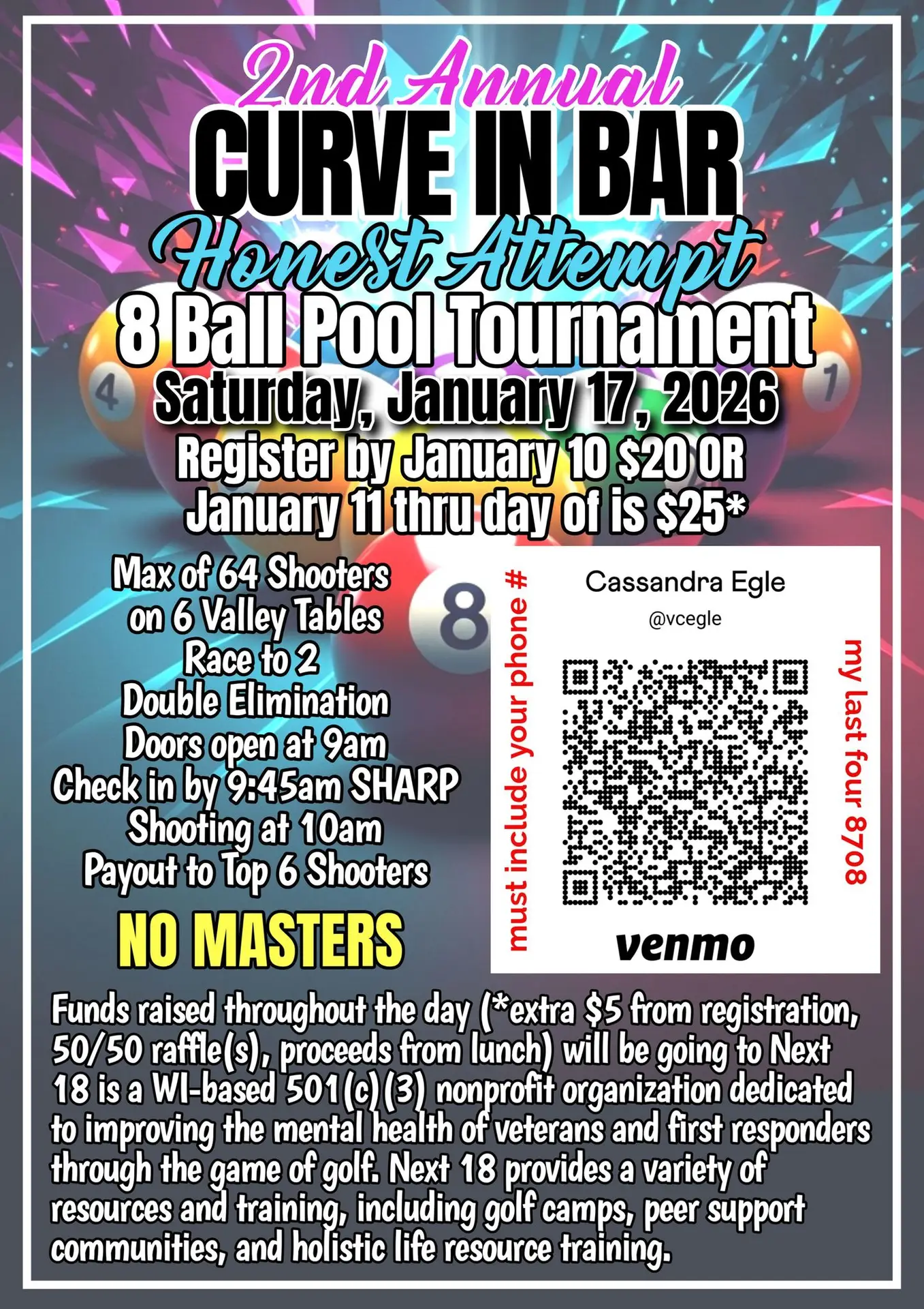 Curve In 2nd Annual Honest Attempt Singles Pool Tournament will have 50/50 raffles and lunch. Proceeds raised from raffles, lunch, and the extra $5 from later entries will go to benefit Next 18 – a Wisconsin-based 501(c)(3) organization that helps veterans and first responders through the game of golf. You can learn more about Next 18 at https://next18.org/