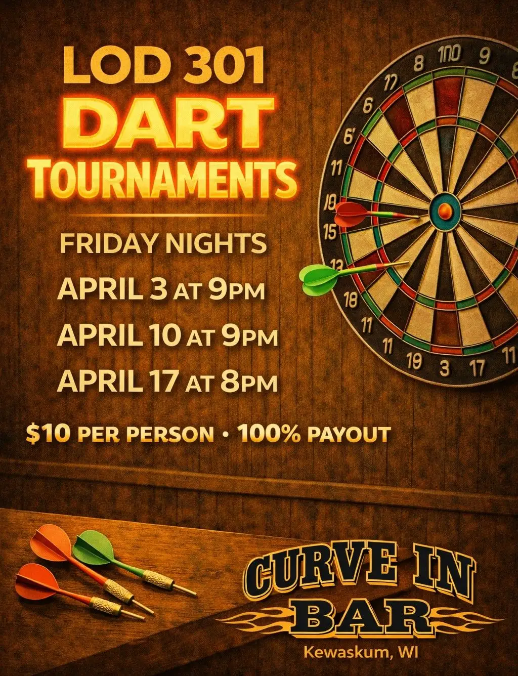 Friday Nights – Luck of the Draw Doubles 301 Dart Tournaments at Curve In.
