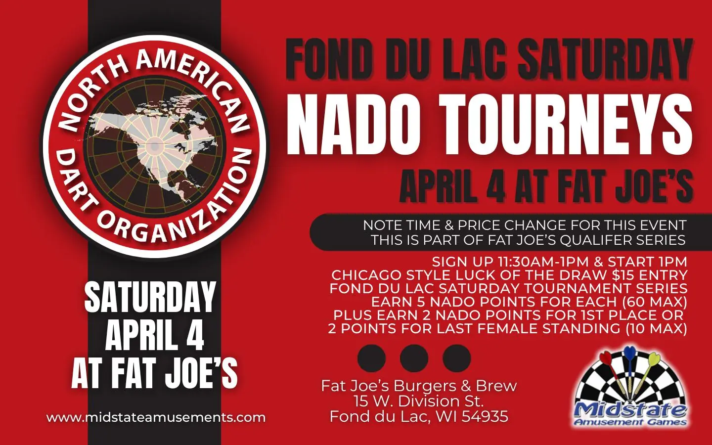 Come out to Fat Joe’s Burgers and Brew on Saturday, April 4th for a luck of the draw Chicago Style Dart Tournament. This tournament will earn NADO points. This tournament also is part of the Fat Joe’s Qualifier Series, so the start time and cost is the same as the Fat Joe’s Series.
