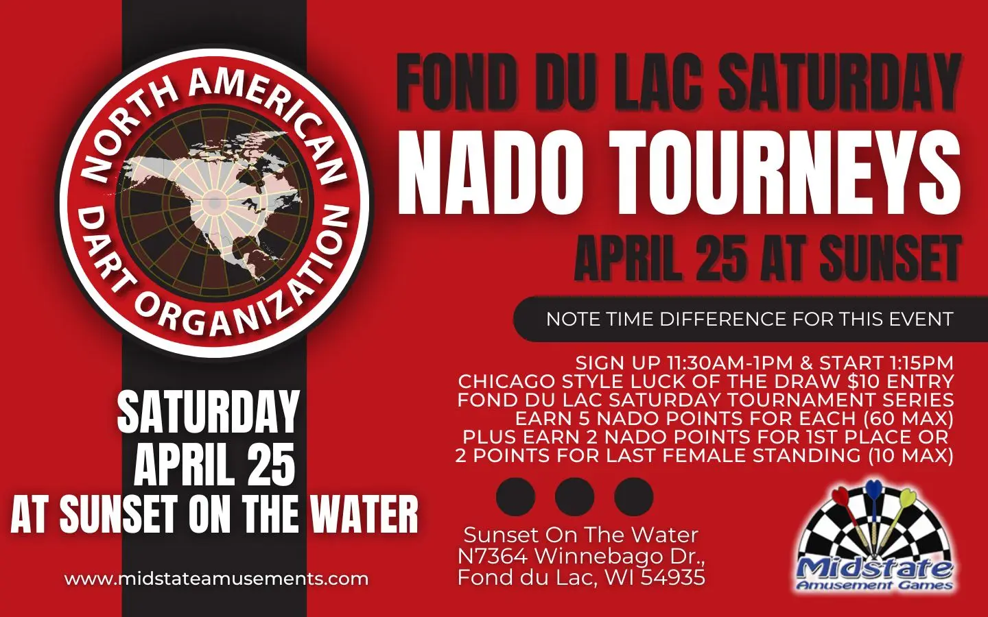 There will be more NADO points dart tournaments around our area through the winter and spring until near the NADO-year-end in June! If you need more points, check out the tournaments in Oshkosh on Saturdays through April and in Sheboygan on the first 2 Saturdays of each month. Looking for more dart tournaments where you can earn NADO points? Go to our website upcoming tournaments page https://midstateamusements.com/events/ and click the box for NADO EVENTS to filter the results!