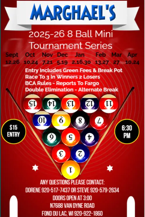 Friday Night Mini Series Pool Tournaments at Marghaels. $15 entry includes greens fees and break pot. 6:30pm start; doors open at 3pm. Race to 3 in winners, 2 in losers. BCA rules. Reports to Fargo. Double Elimination. Alternate Break.