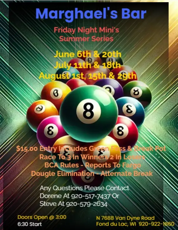 Friday Night Mini Summer Series Pool Tournaments at Marghaels. $15 entry includes greens fees and break pot. 6:30pm start; doors open at 3pm. Race to 3 in winners, 2 in losers. BCA rules. Reports to Fargo. Double Elimination. Alternate Break.