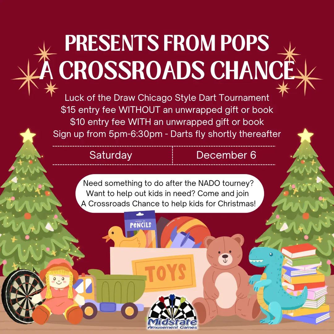 “Need something to do after the NADO tourney? Want to help out kids in need? WELL…..we have the perfect night for you!! Come & join A Crossroads Chance help kids in need for Christmas! We ae hosting a LOD dart tourney after the NADO tourney! Let’s get together and bring some happiness to those in need & have a great night as well!”