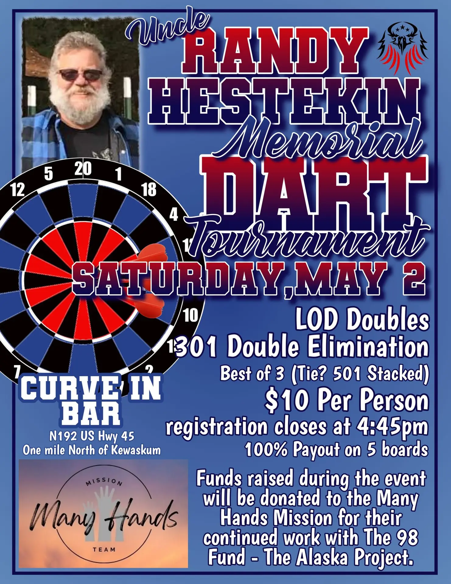 Saturday, May 2nd – Luck of the Draw, Doubles 301, Double Elimination dart tournament. Register before 4:45pm, $10 per person. Funds raised will be given to Many Hands Mission for their work on The 98 Fund Alaska Project, which was important to Randy. You can learn more about Many Hands Mission at https://manyhandsmission.com/.
