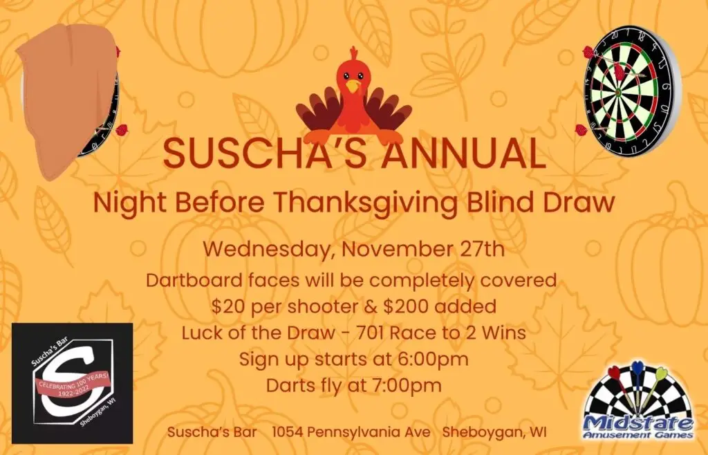 Night before Thanksgiving!!! This will be a luck of the draw tournament. Board faces will be completely covered and the game will be 701 race to 2 wins. $20 per shooter with $200 added. Sign up starts at 6:00pm. Darts fly at 7:00pm!